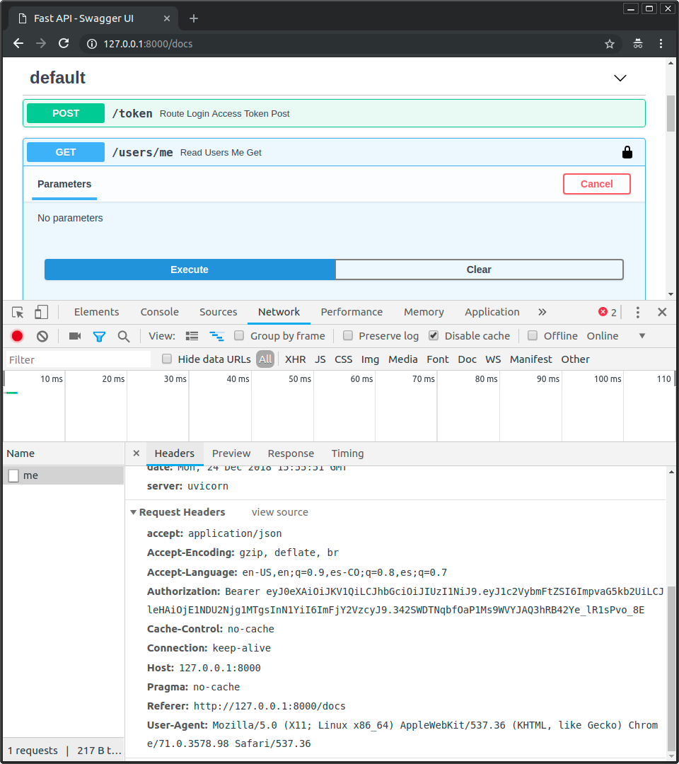 Bearer로 시작하는 Authorization 헤더에 주목하십시오.